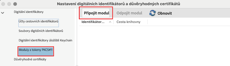 4. V levém menu se ujistěte, že je vybráno PKCS#11 Moduly a tokeny. Klikněte na Připojit modul"