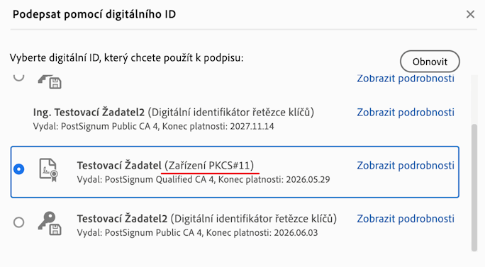 7. Opět otevřete Adobe a vytvořte digitální podpis. V možnostech se zobrazuje připojené zařízení, které vyberete a dáte Pokračovat