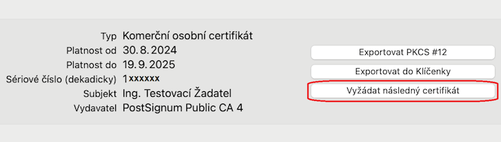 V detailu certifikátu je možné žádat o obnovu certifikátu pomocí tlačítka "Vyžádat následný certifikát" -> "Odeslat žádost".